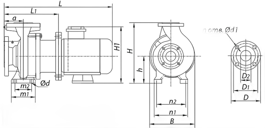 | L* | L1 | n1 | n2 | m1 | m2 | H | H1* | B | h | a | Входной фланец | Выходной фланец | Ød | Насоса | Агрегата* | |||||||||