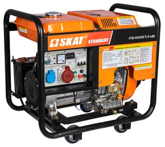 Трехфазный дизельный генератор УГД-6000ЕТ/4кВт мощностью 6 кВт обеспечит энергией строительную площадку и станет отличным помощником для горнопромышленников, аварийных и монтажных бригад. Данная модель выдает 66% мощности на одну фазу вместо обычных 33%. Это значит, что к УГД-6000ЕТ/4кВт можно подключать трехфазные потребители общей мощностью до 6 кВт и однофазные потребители мощностью до 4 кВт. Функция электрозапуска позволяет запускать генератор поворотом ключа.
